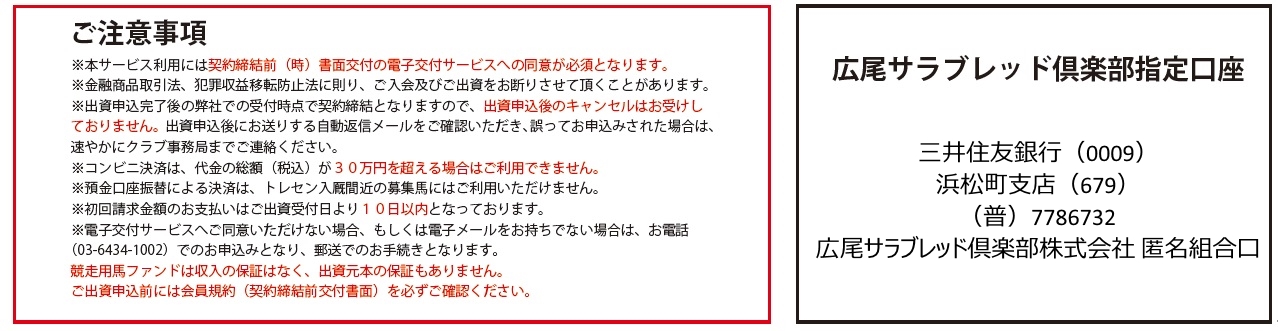 広尾サラブレッド倶楽部ではこの度出資申込の完全Web化をリリースすることとなりました。新しい出資方法では契約締結前(時)書面交付の電子交付サービスを導入することにより、こちらにご同意頂いたお客様につきましては、郵送で契約締結前(時)書面交付を行う必要がなくなり、ご出資申込をWebにて完結することとなります。