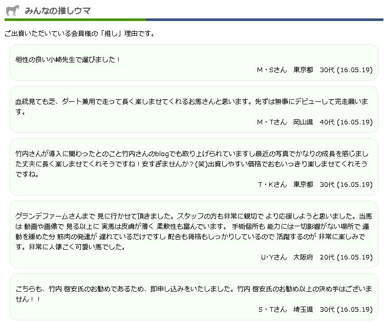 ご出資した方のみが投稿可能なコンテンツ。ご出資理由を投稿して、掲載されたら馬出資金にご利用いただける倶楽部ポイント500ポイントをプレゼント。掲載はご出資手続き完了が条件となります。
