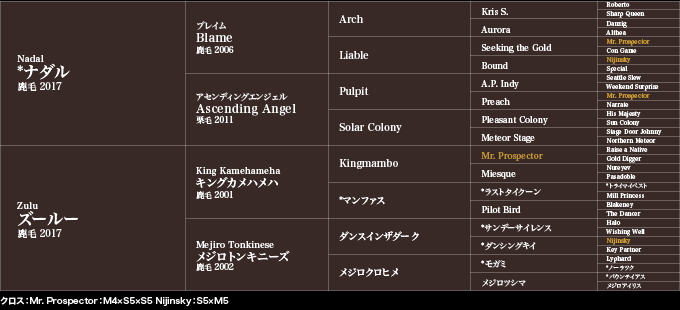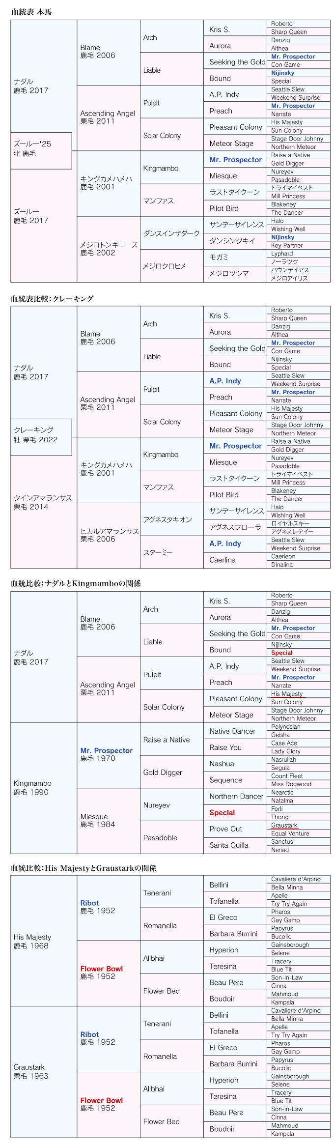 ナダルの父母Liableはキングカメハメハの父KingmamboとMr. Prospector×Northern Dancer×Specialが共通ですし、ナダルの母Ascending AngelにはHis Majestyが入っているため、Kingmambo内のGraustark(=His Majesty)とも呼応しますから、ナダル×キングカメハメハは配合レベルが上がります。牝系はメジロマックイーンを出したメジロアイリス系ですから距離も持ちますし大舞台にも強いので国内外での活躍にも期待が膨らみます。