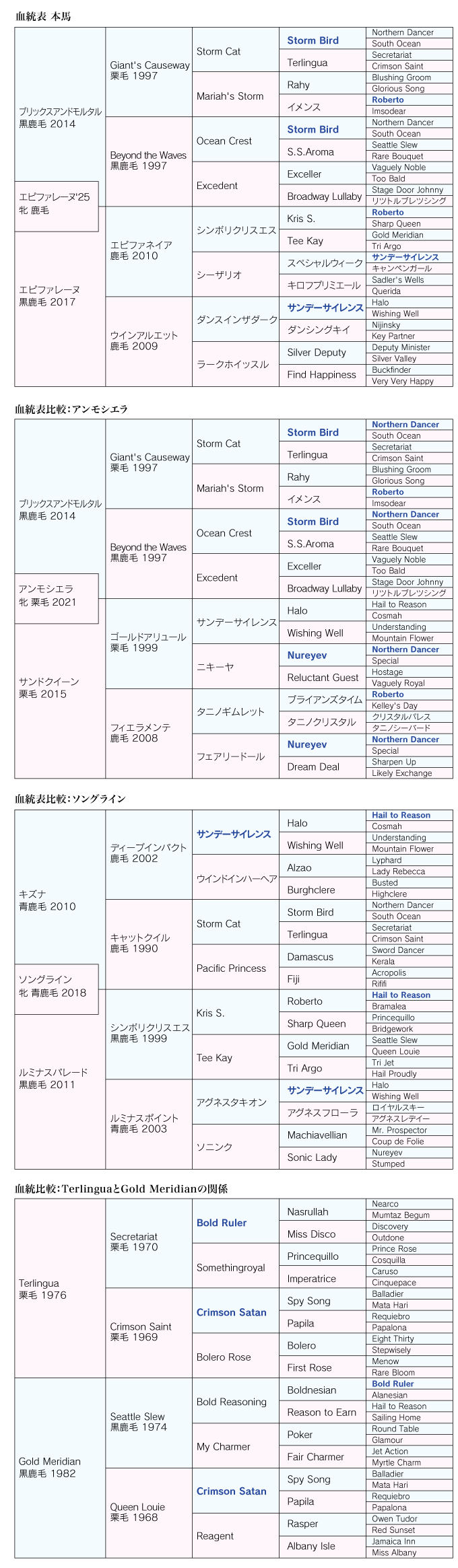 母父エピファネイアという馬はまだ少ないですが、賞金ランキング上位3頭のうち2頭がエピファレーヌの仔です。エピファレーヌは単なるエピファネイア産駒ではなく、スペシャルウィーク≒ダンスインザダークの3×2を持っていて、この仕込みが好結果につながっているのだと思います。今回はStorm Cat系種牡馬が配されましたが、シンボリクリスエスはStorm Catを持っている種牡馬とは相性が良く、キズナ(母父Storm Cat)との間にソングライン(G1安田記念)、アカイイト(G1エリザベス女王杯)、ジューンテイク(G2京都新聞杯)などの活躍馬を送り込んでいます。これはStorm Catの母Terlinguaとシンボリクリスエスの母父Gold Meridianが共にBold Ruler×Princequillo×Crimson Satanを持ち合わせていることに因るもので、Storm Catの注入はエピファレーヌにとってはとても良い選択といえます。生産牧場もアンモシエラと同じ桑田牧場ですし、アンモシエラの再来に期待が高まります。