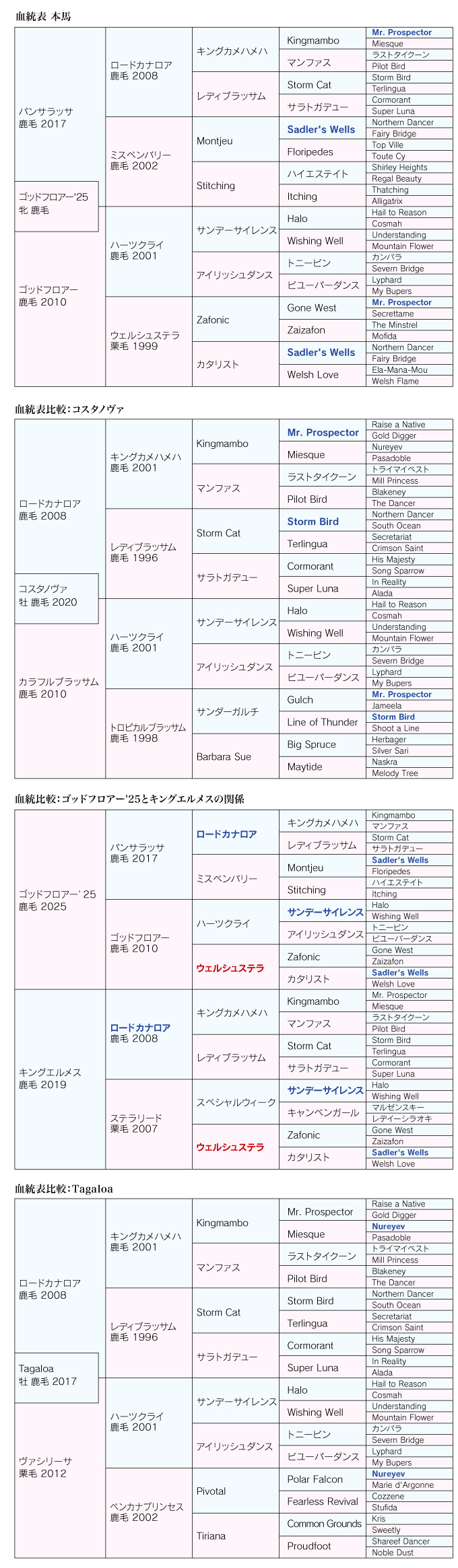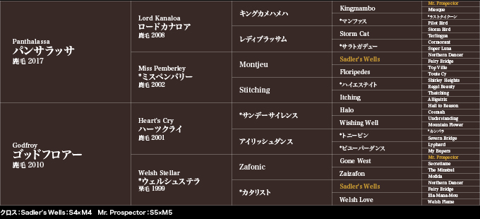 本馬は広尾サラブレッド倶楽部の完全オリジナルといえる募集馬で、ここまでの歴史の集大成ともいえます。父パンサラッサの母はミスペンバリー、母ゴッドフロアーの母はウェルシュステラ。パンサラッサの兄姉にはクリサンセマム、エタンダール、ディメンシオンなど広尾サラブレッド倶楽部の懐かしい活躍馬たちが並び、母ゴッドフロアーの姉には広尾サラブレッド倶楽部の初の重賞勝ち馬ステラリードがいます。ステラリードが函館2歳S(JPN3)を勝ったのが2009年で、パンサラッサが1着賞金1000万米ドル(13億1865万円)のサウジC(KSAG1)を制したのが2023年ですから、長い道のりといえばそうですが、大手牧場全盛時にあって完全独立型の一口クラブが大きな結果を残すというのは大変なことです。本馬は単なるオリジナルブレンドを作ったというわけではなく、緻密な配合のもと生産されています。配合形式はロードカナロア系パンサラッサ×サンデーサイレンス系ハーツクライという形ですが、ロードカナロアとハーツクライはとても相性が良く、コスタノヴァ(G1フェブラリーS)、ロードデルレイ(G2日経新春杯)、ケイデンスコール(G2マイラーズC)、トロワゼトワル(G3京成杯AH)、Tagaloa(豪G1ブルーダイヤモンドS)とG1勝ち馬を含む重賞勝ち馬を多く送り込んでいる鉄板配合。